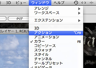 (2) 写真に加える加工の一連の操作を頭に思い描く。今回の例でいうと[リサイズ→トーンカーブ→アンシャープマスク→保存→閉じる]です。一通りイメージできたら[ウインドウ][アクションパネル]を表示させる。
