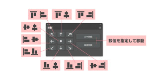 ・数値を指定してオブジェクトを移動したい場合は右側の「水平移動」または「垂直移動」をクリックします。するとダイアログが表示されるので移動する数値を入力して移動をクリック。
