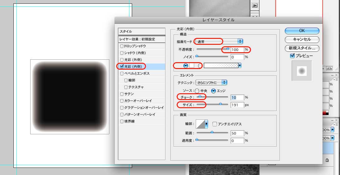 最後にチョークとサイズを調整してぼかし具合を設定し完了。